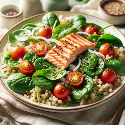 3. 그릇에 시금치, 방울토마토, 익힌 퀴노아를 담고, 구운 연어를 올립니다.