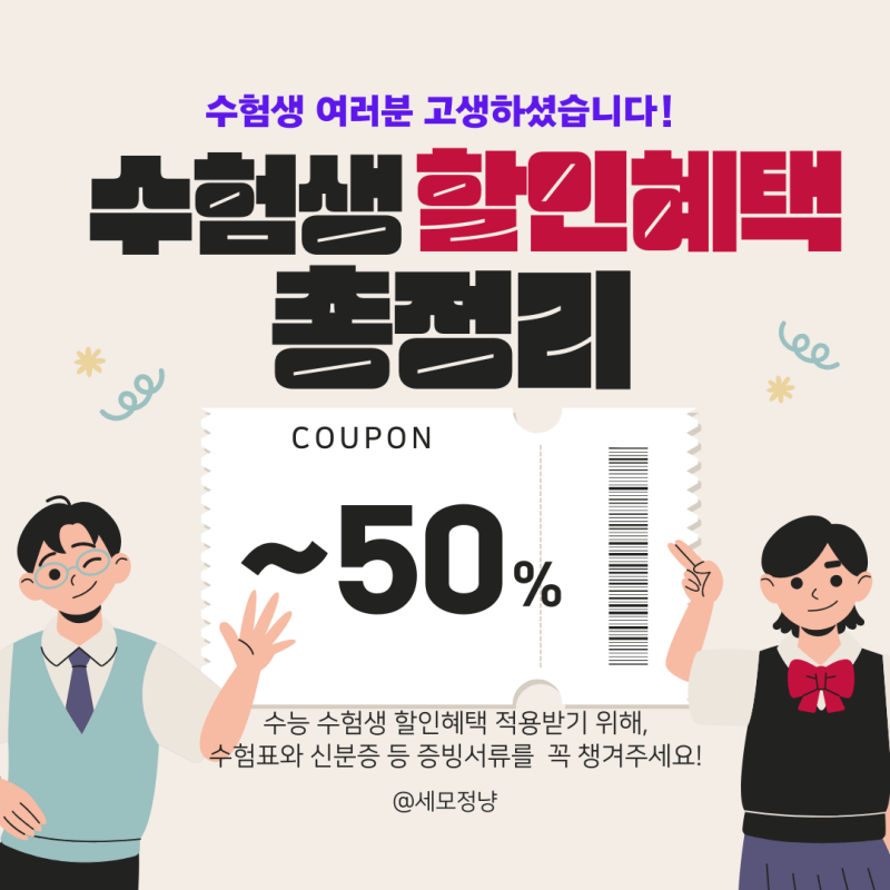- 할인대상 : 수능을 치른 수험생 본인으로 한국 국적과 국내 대학 진학 학생에게 적용